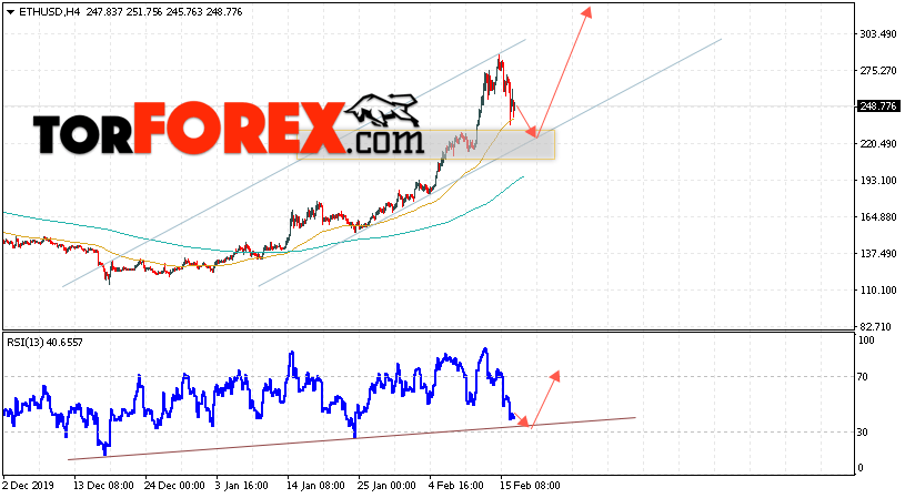 Дополнительным сигналом в пользу подъёма котировок ETH/USD выступит тест линии поддержки на индикаторе относительной силы (RSI). Вторым сигналом станет отскок от нижней границы восходящего канала. Отменой варианта роста криптовалюты станет падение и пробой уровня 205.05. Это укажет на пробой нижнем границы восходящего канала и продолжение падения котировок ETH/USD ниже уровня 165.05. С пробоем области сопротивления и закрытием котировок выше уровня 280.05 стоит ожидать подтверждения развития роста по Ethereum.