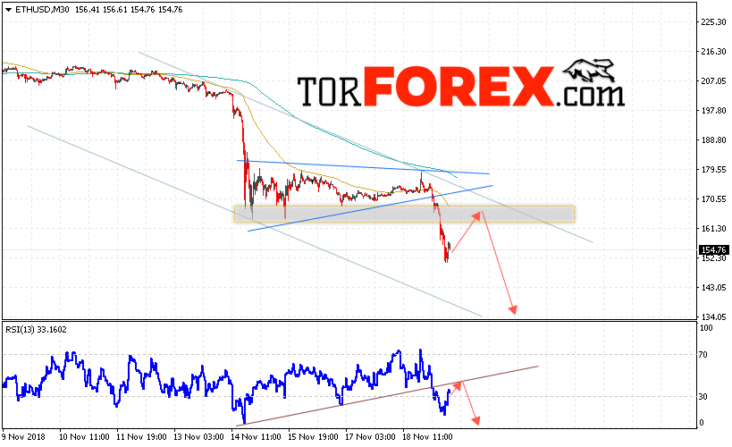 Таким образом, ETH/USD прогноз курса Ethereum на 20 ноября 2018 предполагает попытку теста области сопротивления вблизи уровня 165. Откуда стоит ожидать отскок и продолжения падения криптовалюты ETH/USD в область ниже уровня 135. Дополнительным сигналом в пользу падения Ethereum выступит тест линии тренда на индикаторе относительной силы. Отменой варианта снижения цифровой валюты выступит пробой области 180. Что укажет на продолжение роста с потенциальной целью выше уровня 200.