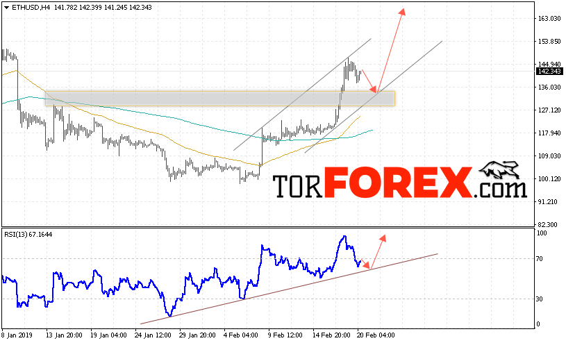 Дополнительным сигналом в пользу роста котировок ETH/USD выступит тест восходящей линии тренда на индикаторе относительной силы. А также отскок от нижней границы восходящего канала. Отменой варианта подъёма криптовалюты станет падение и пробой уровня 125. Это укажет на пробой поддержки и продолжение падения котировок ETH/USD ниже уровня 105. С пробоем области сопротивления и закрытием котировок выше уровня 150 стоит ожидать ускорения развития восходящего движения по Ethereum.