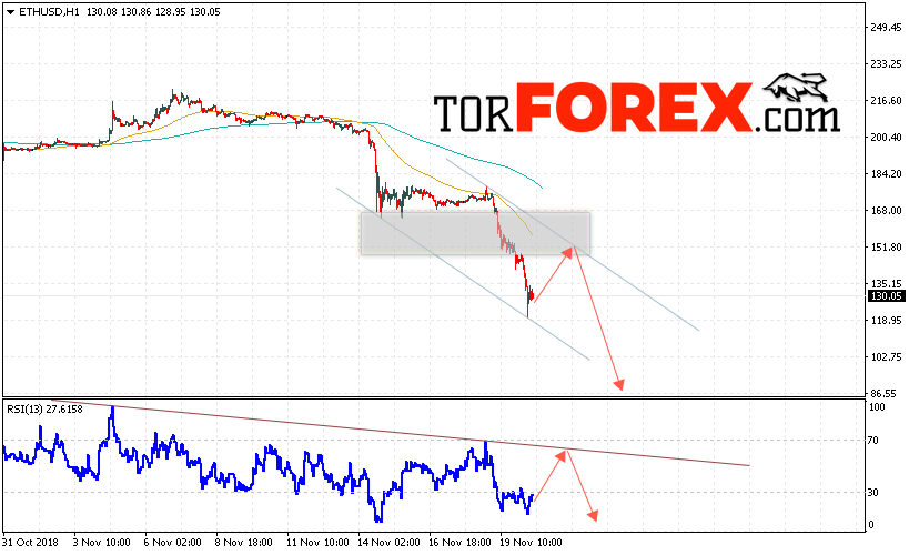 Таким образом, ETH/USD прогноз курса Ethereum на 21 ноября 2018 предполагает попытку теста области сопротивления вблизи уровня 150. Откуда стоит ожидать отскок и продолжения падения криптовалюты ETH/USD в область ниже уровня 90. Дополнительным сигналом в пользу падения Ethereum выступит тест линии тренда на индикаторе относительной силы. Отменой варианта снижения цифровой валюты выступит пробой области 165. Что укажет на продолжение роста с потенциальной целью выше уровня 200.