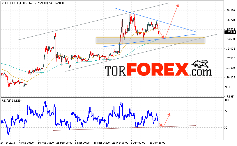 Дополнительным сигналом в пользу роста котировок ETH/USD выступит тест восходящей линии тренда на индикаторе относительной силы. Вторым сигналом станет отскок от нижней модели «Треугольник». Отменой варианта роста криптовалюты станет падение и пробой уровня 145. Это укажет на пробой поддержки и продолжение падения котировок ETH/USD ниже уровня 120. С пробоем области сопротивления и закрытием котировок выше уровня 180 стоит ожидать ускорения развития восходящего движения по Ethereum.