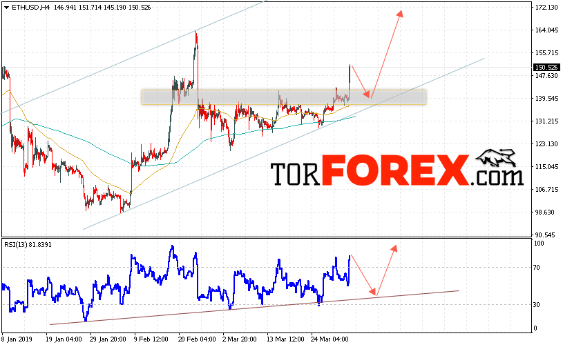 Дополнительным сигналом в пользу роста котировок ETH/USD выступит тест восходящей линии тренда на индикаторе относительной силы. Вторым сигналом станет отскок от нижней границы восходящего канала. Отменой варианта роста криптовалюты станет падение и пробой уровня 135. Это укажет на пробой поддержки и продолжение падения котировок ETH/USD ниже уровня 115. С пробоем области сопротивления и закрытием котировок выше уровня 155 стоит ожидать ускорения развития восходящего движения по Ethereum.