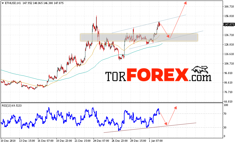 Таким образом, ETH/USD прогноз курса Ethereum на 3 января 2019 предполагает попытку теста области поддержки вблизи уровня 135. Откуда стоит ожидать отскок и продолжения роста криптовалюты ETH/USD в область выше уровня 185. Дополнительным сигналом в пользу роста Ethereum выступит тест линии тренда на индикаторе относительной силы. Отменой варианта роста цифровой валюты выступит пробой области 120. Что укажет на продолжение падения с потенциальной целью ниже уровня 100.
