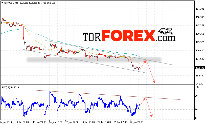 Таким образом, ETH/USD прогноз курса Ethereum на 30 января 2019 предполагает попытку теста области сопротивления вблизи уровня 110. Откуда стоит ожидать отскок и продолжения падения криптовалюты ETH/USD в область ниже уровня 85. Дополнительным сигналом в пользу снижения Ethereum выступит тест линии тренда на индикаторе относительной силы. Отменой варианта падения цифровой валюты выступит пробой области 120. Что укажет на продолжение роста с потенциальной целью выше уровня 145.