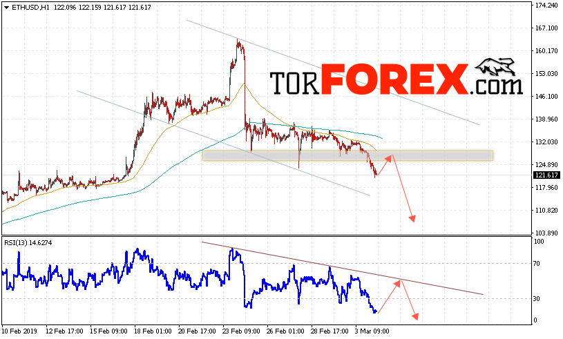 Таким образом, ETH/USD прогноз курса Ethereum на 5 марта 2019 предполагает попытку теста области сопротивления вблизи уровня 125. Откуда стоит ожидать отскок и продолжения падения криптовалюты ETH/USD в область ниже уровня 100. Дополнительным сигналом в пользу снижения Ethereum выступит тест линии тренда на индикаторе относительной силы. Отменой варианта падения цифровой валюты выступит пробой области 140. Что укажет на продолжение подъёма с потенциальной целью выше уровня 165.