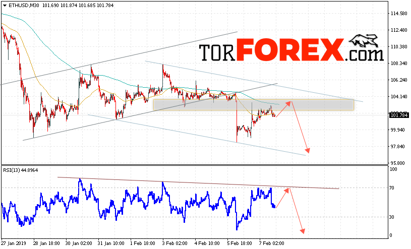 Дополнительным сигналом в пользу падения котировок ETH/USD выступит тест нисходящей линии тренда на индикаторе относительной силы. А также отскок от верхней границы нисходящего канала. Отменой варианта падения криптовалюты станет сильный рост и пробой уровня 107. Это укажет на пробой сопротивления и продолжение падения котировок ETH/USD выше уровня 125. С пробоем области поддержки и закрытием котировок ниже уровня 95 стоит ожидать ускорения развития нисходящего движения по Ethereum.