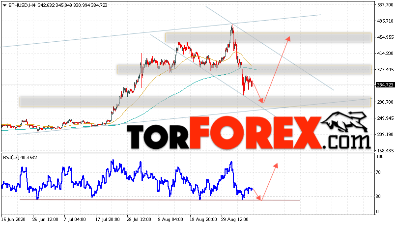 Таким образом, ETH/USD прогноз курса Ethereum на 9 сентября 2020 предполагает попытку коррекции и тест области поддержки вблизи уровня 290.55. Откуда стоит ожидать отскок и продолжения роста криптовалюты ETH/USD в область выше уровня 455.05. Дополнительным сигналом в пользу подъёма Ethereum выступит тест линии тренда на индикаторе относительной силы. Отменой варианта роста цифровой валюты станет пробой области 245.05. Что укажет на продолжение падения с потенциальной целью ниже уровня 205.05.