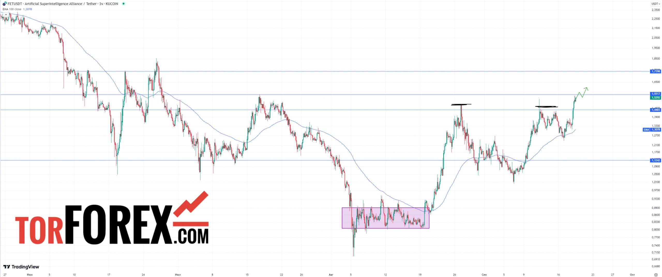 FET — это служебный токен проекта, который является основой для поиска, создания, развертывания и обучения автономных экономических агентов на платформе. 17 сентября компания провела мероприятие на котором поделилась своими новыми разработками в области искусственного интеллекта. Инвесторами и трейдерами с позитивом была принята данная новость, и цена пробила сопротивление на уровне $1.44, уверенно вырвавшись вверх к текущим отметкам $1.59.