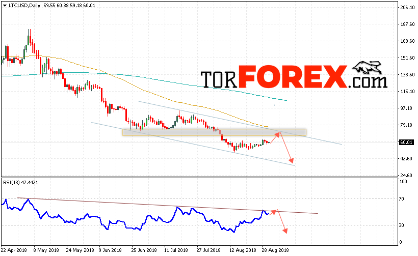 В пользу снижения котировок LTC/USD на текущей торговой неделе 3 — 7 сентября 2018 выступит тест линии сопротивления на индикаторе относительной силы. Отменой варианта падения Litecoin станет сильный рост и пробой области 80.00, что укажет на пробой верхней границы нисходящего канала и продолжение роста LTC/USD. Подтверждением снижения криптовалюты выступит пробой области поддержки и закрытие котировок ниже уровня 55.00.