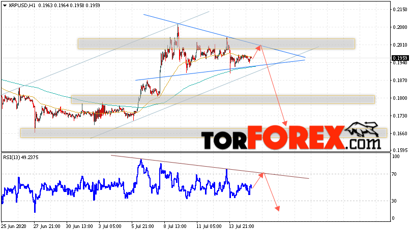 В пользу падения котировок XRP/USD выступит тест нисходящего линии тренда на индикаторе относительной силы. Вторым сигналом в пользу снижения котировок актива станет отскок от верхней границы модели «Треугольник». Отменой варианта падения криптовалюты станет сильный рост и закрытие котировок выше уровня 0.2105. Это укажет на пробой области сопротивления и продолжение роста XRP/USD в область выше уровня 0.2355. Подтверждением падения курса цифровой валюты выступит пробой области поддержки и закрытие под уровнем 0.1845. В этом случае стоит ожидать ускорения развития падения стоимости Ripple.