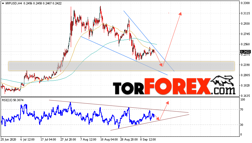 Котировки XRP/USD торгуются на уровне 0.2422 и продолжают движение в рамках падения и формирования модели ”Клин”. Капитализация криптовалюты Ripple в момент публикации прогноза составляет $11 029 682 382. Скользящие средние указывают на наличие краткосрочной медвежьей тенденции по Ripple. Цены тестируют область между сигнальными линиями, что указывает на давление со стороны продавцов актива и потенциальное продолжение падения. На данный момент стоит ожидать попытку продолжения развития нисходящей коррекции цифрового актива и тест уровня поддержки вблизи области 0.2195. Далее, отскок вверх и продолжение роста криптовалюты в область выше уровня 0.3125.