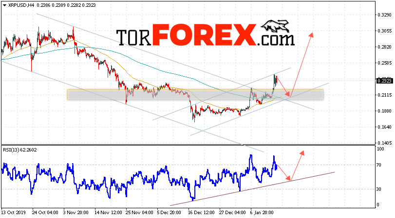 В пользу подъёма котировок XRP/USD выступит тест восходящей линии тренда на индикаторе относительной силы. Вторым сигналом в пользу роста котировок актива станет отскок от нижней границы восходящего канала. Отменой варианта подъёма криптовалюты станет падение и закрытие котировок ниже уровня 0.2005. Это укажет на пробой области поддержки и продолжение падения XRP/USD в область ниже уровня 0.1705. Подтверждением роста курса цифровой валюты выступит пробой верхней границы нисходящего канала и закрытие над уровнем 0.2445. В этом случае стоит ожидать ускорения развития роста стоимости Ripple.