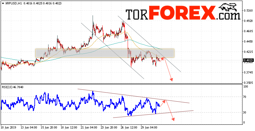 Таким образом, Криптовалюта Ripple прогноз курса на 2 июля 2019 предполагает попытку теста уровня сопротивления вблизи области 0.4075. Откуда стоит ожидать продолжения падения криптовалюты с потенциальной целью на уровне 0.3505. Дополнительным сигналом в пользу снижения Ripple выступит тест линии тренда на индикаторе относительной силы. Отменой варианта падения котировок станет сильный рост и пробой области 0.4365. В этом случае стоит ожидать продолжения развития восходящей тенденции по цифровой валюте с целью ниже 0.4765.