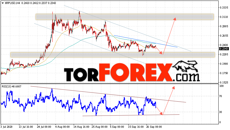 В пользу подъёма котировок XRP/USD выступит тест восходящей линии тренда на индикаторе относительной силы. Вторым сигналом в пользу роста котировок актива станет отскок от нижней границы модели ”Голова и плечи”. Отменой варианта роста криптовалюты станет падение и закрытие котировок ниже уровня 0.1935. Это укажет на пробой области поддержки и продолжение падения XRP/USD в область ниже уровня 0.1745. Подтверждением роста курса цифровой валюты выступит пробой области сопротивления и закрытие над уровнем 0.2645.