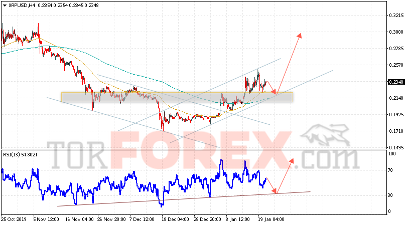 Котировки XRP/USD торгуются на уровне 0.2348 и продолжают движение в рамках роста и восходящего канала. Капитализация криптовалюты Ripple в момент публикации прогноза составляет $10 342 613 023. Скользящие средние указывают на наличие краткосрочной бычьей тенденции по Ripple. Цены отталкиваются от области между сигнальными линиями вверх, что указывает на давление со стороны покупателей. На данный момент стоит ожидать попытку снижения цифрового актива и тест уровня поддержки вблизи области 0.2175. Далее, продолжение роста криптовалюты в область выше уровня 0.3025.
