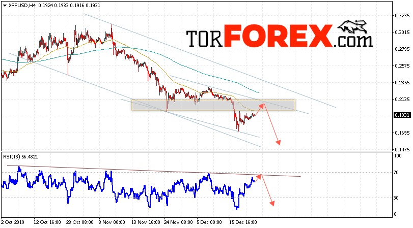 В пользу снижения котировок XRP/USD выступит тест линии тренда на индикаторе относительной силы. Вторым сигналом в пользу падения котировок актива станет отскок от верхней границы нисходящего канала. Отменой варианта снижения криптовалюты станет сильный рост и закрытие котировок выше уровня 0.2235. Это укажет на пробой области сопротивления и продолжение роста XRP/USD в область выше уровня 0.2605. Подтверждением падения курса цифровой валюты выступит пробой области поддержки и закрытие под уровнем 0.1605. В этом случае стоит ожидать ускорения развития нисходящей тенденции Ripple.