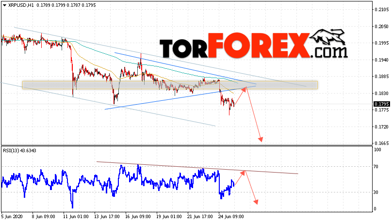Таким образом, Криптовалюта Ripple прогноз курса на 26 июня 2020 предполагает попытку теста уровня сопротивления вблизи области 0.1830. Откуда стоит ожидать продолжения падения криптовалюты с потенциальной целью на уровне 0.1655. Дополнительным сигналом в пользу снижения Ripple выступит тест линии тренда на индикаторе относительной силы. Отменой варианта падения котировок станет сильный рост и пробой области 0.1925. В этом случае стоит ожидать продолжения развития подъёма по цифровой валюте с целью выше 0.2225.