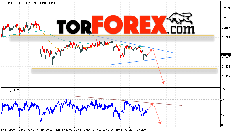 Таким образом, Криптовалюта Ripple прогноз курса на 26 мая 2020 предполагает попытку теста уровня сопротивления вблизи области 0.2075. Откуда стоит ожидать продолжения падения криптовалюты с потенциальной целью на уровне 0.1645. Дополнительным сигналом в пользу снижения Ripple выступит тест линии тренда на индикаторе относительной силы. Отменой варианта падения котировок станет сильный рост и пробой области 0.2075. В этом случае стоит ожидать продолжения развития подъёма по цифровой валюте с целью выше 0.2545.