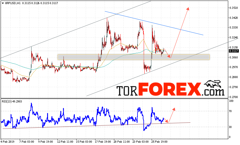 В пользу подъёма котировок XRP/USD выступит тест восходящей линии тренда на индикаторе относительной силы. А также отскок от нижней границы восходящего канала. Отменой варианта роста криптовалюты станет падение и закрытие котировок ниже уровня 0.2895. Это укажет на пробой нижнем границы канала и продолжение падения XRP/USD в область ниже уровня 0.2650. С пробоем области сопротивления и закрытием выше уровня 0.3355 стоит ожидать подтверждения развития роста по Ripple.