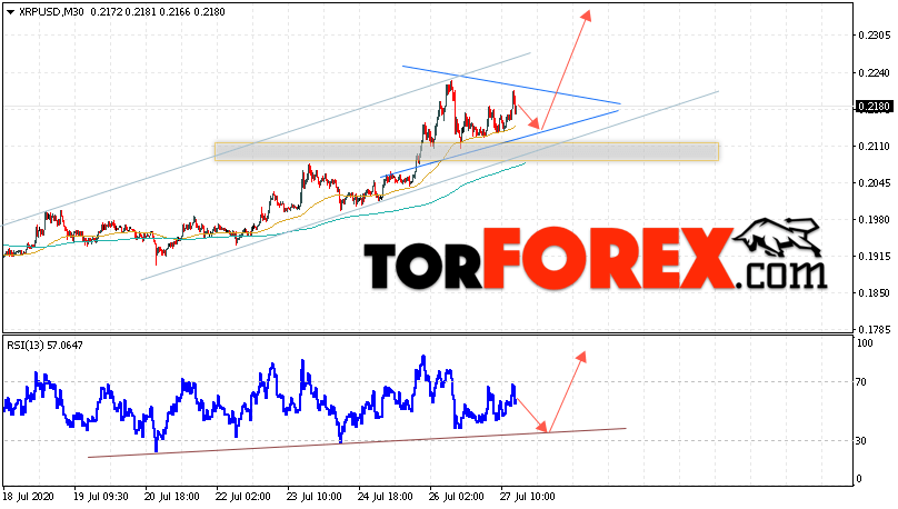 Таким образом, Криптовалюта Ripple прогноз курса на 28 июля 2020 предполагает попытку теста уровня поддержки вблизи области 0.2155. Откуда стоит ожидать продолжения роста криптовалюты с потенциальной целью на уровне 0.2455. Дополнительным сигналом в пользу подъёма Ripple выступит тест линии тренда на индикаторе относительной силы. Отменой варианта роста котировок станет падение и пробой области 0.2045. В этом случае стоит ожидать продолжения развития снижения по цифровой валюте с целью ниже 0.1865.