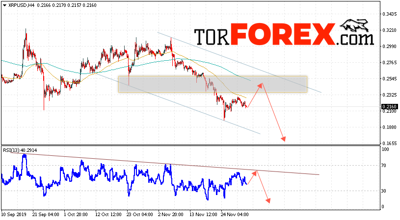 В пользу снижения котировок XRP/USD выступит тест нисходящей линии тренда на индикаторе относительной силы. Вторым сигналом в пользу падения котировок актива станет отскок от верхней границы нисходящего канала. Отменой варианта падения криптовалюты станет сильный рост и закрытие котировок выше уровня 0.2705. Это укажет на пробой области сопротивления и продолжение роста XRP/USD в область выше уровня 0.2955. Подтверждением падения курса цифровой валюты выступит пробой области поддержки и закрытие под уровнем 0.1885. В этом случае стоит ожидать ускорения развития нисходящей тенденции Ripple.