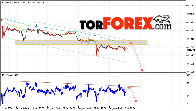 В пользу падения котировок XRP/USD выступит тест нисходящего линии тренда на индикаторе относительной силы. Вторым сигналом в пользу снижения котировок актива станет отскок от верхней границы нисходящего канала. Отменой варианта падения криптовалюты станет сильный рост и закрытие котировок выше уровня 0.1875. Это укажет на пробой области сопротивления и продолжение роста XRP/USD в область выше уровня 0.2145. Подтверждением падения курса цифровой валюты выступит пробой области поддержки и закрытие под уровнем 0.1605. В этом случае стоит ожидать ускорения развития падения стоимости Ripple.