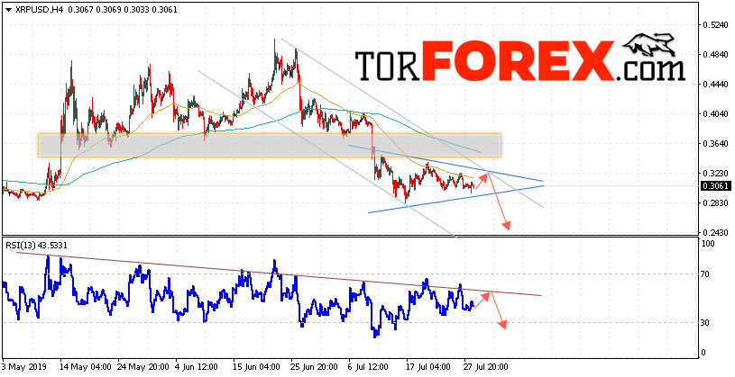 Таким образом, Криптовалюта Ripple прогноз курса на 30 июля 2019 предполагает попытку теста уровня сопротивления вблизи области 0.3235. Откуда стоит ожидать продолжения падения криптовалюты с потенциальной целью на уровне 0.2435. Дополнительным сигналом в пользу снижения Ripple выступит тест линии тренда на индикаторе относительной силы. Отменой варианта падения котировок станет сильный рост и пробой области 0.3365. В этом случае стоит ожидать продолжения развития восходящей тенденции по цифровой валюте с целью выше 0.3750.
