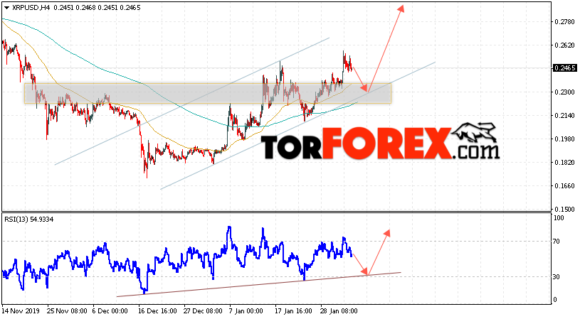 В пользу подъёма котировок XRP/USD выступит тест восходящей линии тренда на индикаторе относительной силы. Вторым сигналом в пользу роста котировок актива станет отскок от нижней границы восходящего канала. Отменой варианта подъёма криптовалюты станет падение и закрытие котировок ниже уровня 0.2130. Это укажет на пробой области поддержки и продолжение падения XRP/USD в область ниже уровня 0.1695. Подтверждением роста курса цифровой валюты выступит пробой области сопротивления и закрытие над уровнем 0.2665. В этом случае стоит ожидать ускорения развития роста стоимости Ripple.