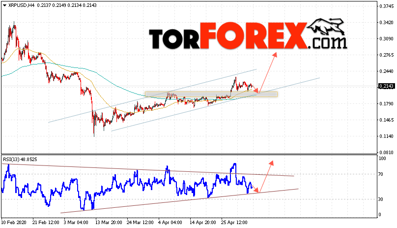В пользу подъёма котировок XRP/USD выступит тест линии поддержки на индикаторе относительной силы. Вторым сигналом в пользу роста котировок актива станет отскок от нижней границы восходящего канала. Отменой варианта роста криптовалюты станет падение и закрытие котировок ниже уровня 0.1805. Это укажет на пробой области поддержки и продолжение падения XRP/USD в область ниже уровня 0.1605. Подтверждением роста курса цифровой валюты выступит пробой области сопротивления и закрытие над уровнем 0.2465. В этом случае стоит ожидать ускорения развития роста стоимости Ripple.