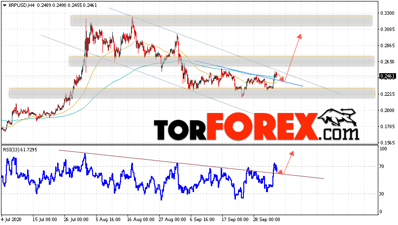 Таким образом, Криптовалюта Ripple прогноз курса на 6 октября 2020 предполагает попытку теста уровня поддержки вблизи области 0.2355. Откуда стоит ожидать продолжения роста криптовалюты с потенциальной целью на уровне 0.3025. Дополнительным сигналом в пользу подъёма Ripple выступит тест линии тренда на индикаторе относительной силы. Отменой варианта роста котировок станет падение и пробой области 0.1965. В этом случае стоит ожидать продолжения развития снижения по цифровой валюте с целью ниже 0.1805.