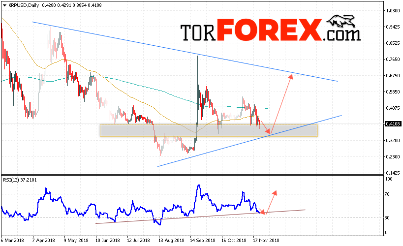 Таким образом, Криптовалюта Ripple прогноз на 26 — 30 ноября 2018 предполагает попытку теста уровня поддержки вблизи области 0.3500. Откуда стоит ожидать продолжения роста котировок с потенциальной целью на уровне 0.6750. Дополнительным сигналом в пользу роста Ripple выступит тест линии тренда на индикаторе относительной силы. Отменой роста криптовалюты выступит пробой области 0.3000. Это укажет на продолжение снижения.