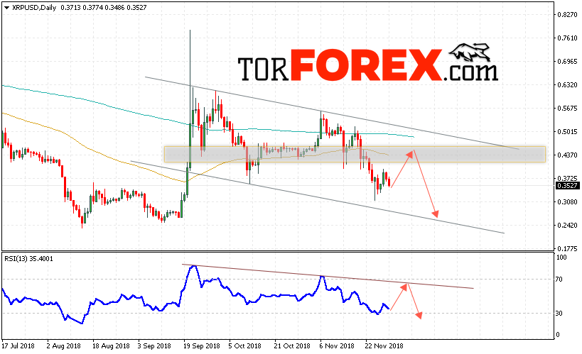 В пользу снижения котировок XRP/USD на текущей торговой неделе 3 — 7 декабря 2018 выступит тест линии тренда на индикаторе относительной силы. Отменой варианта падения криптовалюты Ripple станет сильный рост и пробой области 0.5200. Это укажет на пробой верхней границы канала и продолжение роста котировок XRP/USD. Подтверждением снижения криптовалюты выступит пробой области поддержки и закрытие котировок ниже уровня 0.2850.
