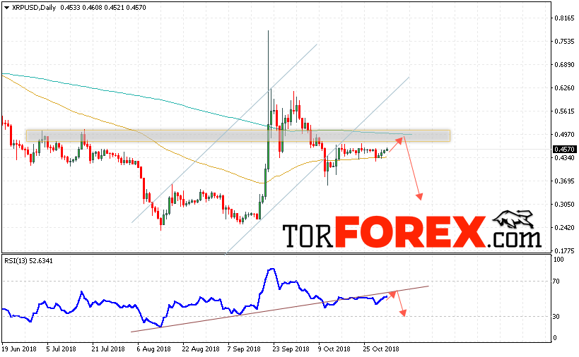 В пользу снижения котировок XRP/USD на текущей торговой неделе 5 — 9 ноября 2018 2018 выступит тест линии тренда на индикаторе относительной силы, а также отскок от верхней границы нисходящего канала. Отменой варианта падения криптовалюты Ripple станет сильный рост и пробой области 0.5300, что укажет на пробой области сопротивления и продолжение роста котировок XRP/USD. Подтверждением падения криптовалюты выступит пробой области поддержки и закрытие котировок нижней уровня 0.3750.