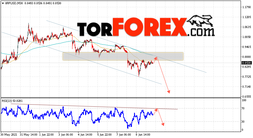 В пользу снижения котировок XRP/USD выступит тест нисходящей линии тренда на индикаторе относительной силы. Вторым сигналом в пользу падения котировок актива станет отскок от верхней границы нисходящего канала. Отменой варианта снижения криптовалюты станет сильный рост и закрытие котировок выше уровня 0.9505. Это укажет на пробой области сопротивления и продолжение подъёма XRP/USD в область выше уровня 1.0505. Подтверждением падения курса цифровой валюты выступит пробой области поддержки и закрытие под уровнем 0.7955.