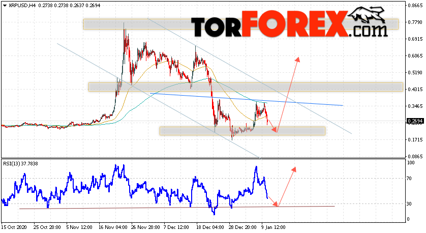 Таким образом, Криптовалюта XRP прогноз курса на 12 января 2021 предполагает попытку теста уровня поддержки вблизи области 0.1895. Откуда стоит ожидать продолжения подъёма криптовалюты с потенциальной целью на уровне 0.6065. Дополнительным сигналом в пользу роста Ripple выступит тест линии тренда на индикаторе относительной силы. Отменой варианта подъёма котировок станет падение и пробой области 0.1545. В этом случае стоит ожидать продолжения снижения подъёма по цифровой валюте с целью ниже 0.0825.