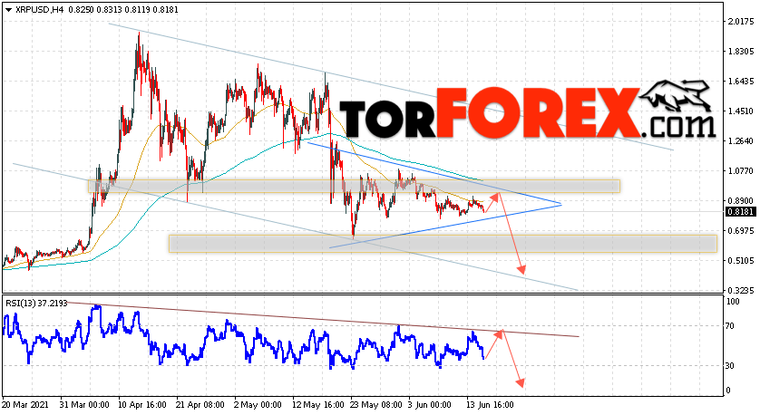 В пользу снижения котировок XRP/USD выступит тест нисходящей линии тренда на индикаторе относительной силы. Вторым сигналом в пользу падения котировок актива станет отскок от верхней границы модели ”Треугольник”. Отменой варианта снижения криптовалюты станет сильный рост и закрытие котировок выше уровня 1.0855. Это укажет на пробой области сопротивления и продолжение подъёма XRP/USD в область выше уровня 1.2505. Подтверждением падения курса цифровой валюты выступит пробой области поддержки и закрытие под уровнем 0.6805, что укажет на пробой нижней границы модели ”Треугольник”.