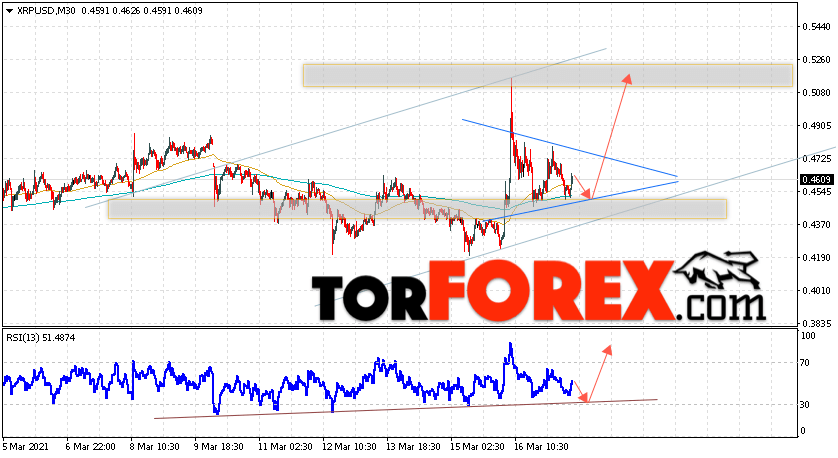 Таким образом, Криптовалюта XRP прогноз курса на 18 марта 2021 предполагает попытку теста уровня поддержки вблизи области 0.4435. Откуда стоит ожидать продолжения подъёма криптовалюты с потенциальной целью на уровне 0.5245. Дополнительным сигналом в пользу роста Ripple выступит тест линии тренда на индикаторе относительной силы. Отменой варианта подъёма котировок станет падение и пробой области 0.3995. В этом случае стоит ожидать продолжения снижения подъёма по цифровой валюте с целью ниже 0.3245.