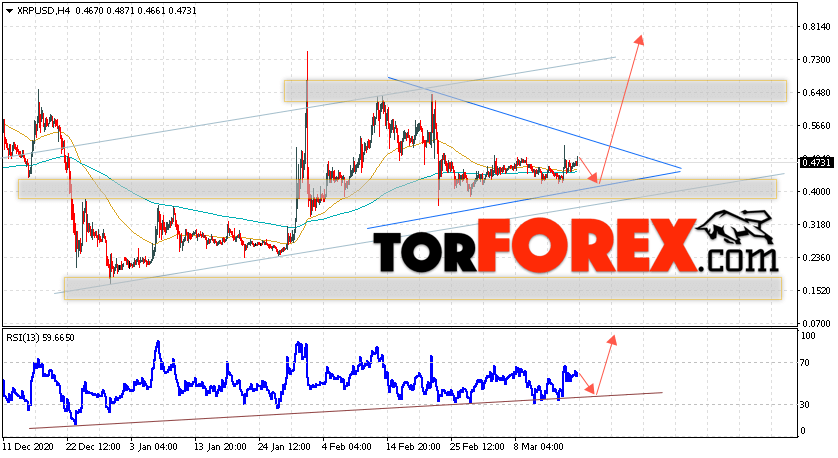 Таким образом, Криптовалюта XRP прогноз курса на 19 марта 2021 предполагает попытку теста уровня поддержки вблизи области 0.4205. Откуда стоит ожидать продолжения подъёма криптовалюты с потенциальной целью на уровне 0.7375. Дополнительным сигналом в пользу роста Ripple выступит тест линии тренда на индикаторе относительной силы. Отменой варианта подъёма котировок станет падение и пробой области 0.3855. В этом случае стоит ожидать продолжения снижения подъёма по цифровой валюте с целью ниже 0.3205.