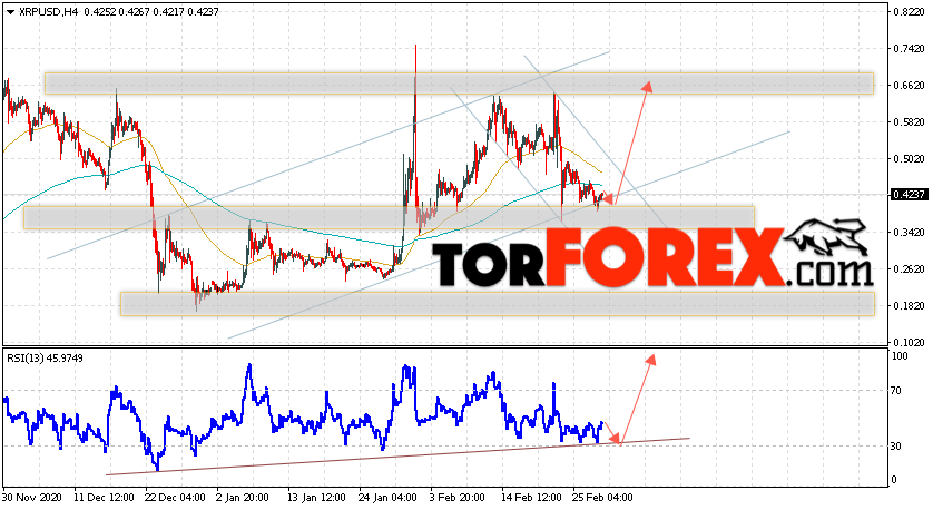 Таким образом, Криптовалюта XRP прогноз курса на 2 марта 2021 предполагает попытку теста уровня поддержки вблизи области 0.4205. Откуда стоит ожидать продолжения подъёма криптовалюты с потенциальной целью на уровне 0.6645. Дополнительным сигналом в пользу роста Ripple выступит тест линии тренда на индикаторе относительной силы. Отменой варианта подъёма котировок станет падение и пробой области 0.3375. В этом случае стоит ожидать продолжения снижения подъёма по цифровой валюте с целью ниже 0.2865.