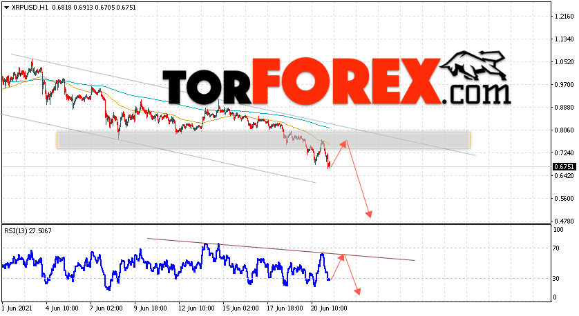 В пользу снижения котировок XRP/USD выступит тест нисходящей линии тренда на индикаторе относительной силы. Вторым сигналом в пользу падения котировок актива станет отскок от верхней границы нисходящего канала. Отменой варианта снижения криптовалюты станет сильный рост и закрытие котировок выше уровня 0.8805. Это укажет на пробой области сопротивления и продолжение подъёма XRP/USD в область выше уровня 1.1505. Подтверждением падения курса цифровой валюты выступит пробой области поддержки и закрытие под уровнем 0.6305.