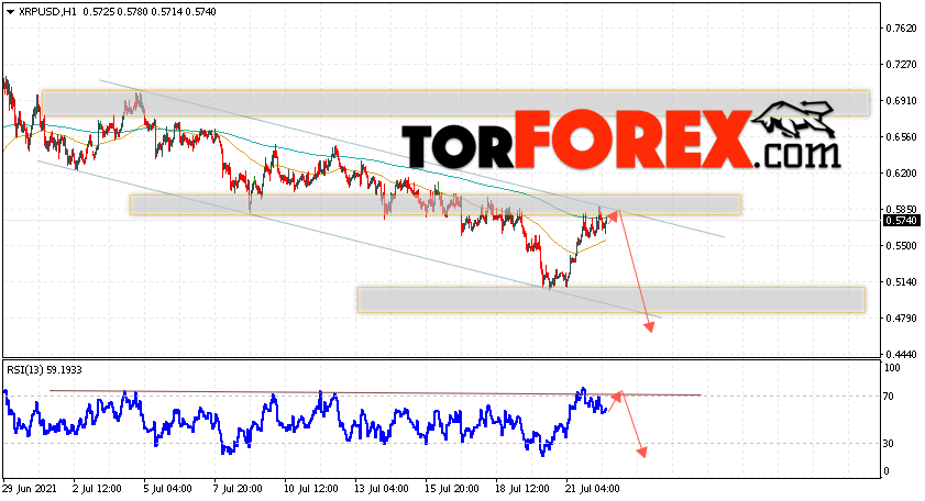 В пользу снижения котировок XRP/USD выступит тест линии сопротивления на индикаторе относительной силы. Вторым сигналом в пользу падения котировок актива станет отскок от верхней границы нисходящего канала. Отменой варианта снижения криптовалюты станет сильный рост и закрытие котировок выше уровня 0.6275. Это укажет на пробой области сопротивления и продолжение подъёма XRP/USD в область выше уровня 0.6755. Подтверждением падения курса цифровой валюты выступит пробой области поддержки и закрытие под уровнем 0.5305.