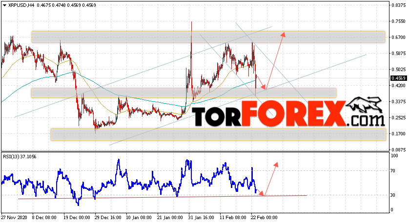 Таким образом, Криптовалюта XRP прогноз курса на 24 февраля 2021 предполагает попытку теста уровня поддержки вблизи области 0.4175. Откуда стоит ожидать продолжения подъёма криптовалюты с потенциальной целью на уровне 0.6725. Дополнительным сигналом в пользу роста Ripple выступит тест линии тренда на индикаторе относительной силы. Отменой варианта подъёма котировок станет падение и пробой области 0.3105. В этом случае стоит ожидать продолжения снижения подъёма по цифровой валюте с целью ниже 0.2505.