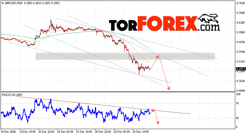 В пользу снижения котировок XRP/USD выступит тест нисходящей линии тренда на индикаторе относительной силы. Вторым сигналом в пользу роста котировок актива станет отскок от верхней границы нисходящего канала. Отменой варианта падения криптовалюты станет сильный рост и закрытие котировок выше уровня 0.4805. Это укажет на пробой области сопротивления и продолжение подъёма XRP/USD в область выше уровня 0.5505. Подтверждением падения курса цифровой валюты выступит пробой области поддержки и закрытие под уровнем 0.2305.