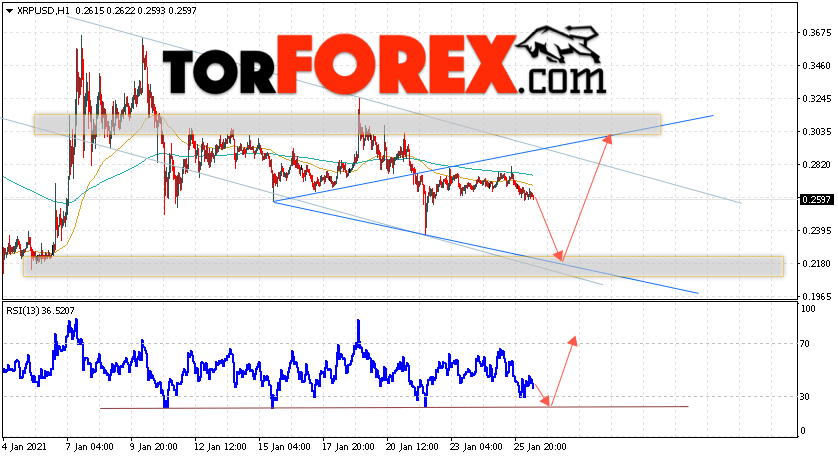Таким образом, Криптовалюта XRP прогноз курса на 27 января 2021 предполагает попытку теста уровня поддержки вблизи области 0.2195. Откуда стоит ожидать продолжения подъёма криптовалюты с потенциальной целью на уровне 0.2925. Дополнительным сигналом в пользу роста Ripple выступит тест линии тренда на индикаторе относительной силы. Отменой варианта подъёма котировок станет падение и пробой области 0.1915. В этом случае стоит ожидать продолжения снижения подъёма по цифровой валюте с целью ниже 0.1625.