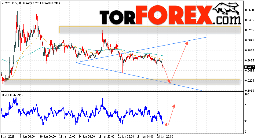 Таким образом, Криптовалюта XRP прогноз курса на 28 января 2021 предполагает попытку теста уровня поддержки вблизи области 0.2195. Откуда стоит ожидать продолжения подъёма криптовалюты с потенциальной целью на уровне 0.2965. Дополнительным сигналом в пользу роста Ripple выступит тест линии тренда на индикаторе относительной силы. Отменой варианта подъёма котировок станет падение и пробой области 0.1825. В этом случае стоит ожидать продолжения снижения подъёма по цифровой валюте с целью ниже 0.1605.