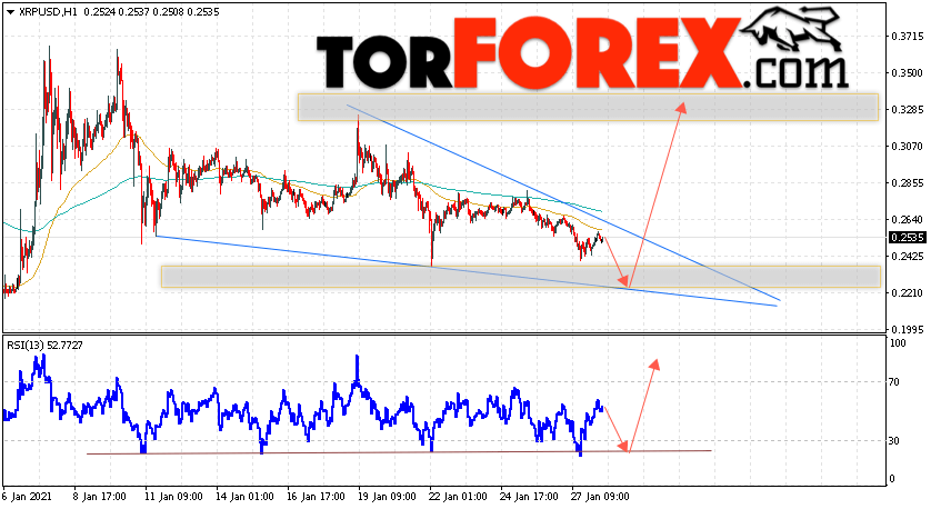 Таким образом, Криптовалюта XRP прогноз курса на 29 января 2021 предполагает попытку теста уровня поддержки вблизи области 0.2215. Откуда стоит ожидать продолжения подъёма криптовалюты с потенциальной целью на уровне 0.3285. Дополнительным сигналом в пользу роста Ripple выступит тест линии тренда на индикаторе относительной силы. Отменой варианта подъёма котировок станет падение и пробой области 0.1865. В этом случае стоит ожидать продолжения снижения подъёма по цифровой валюте с целью ниже 0.1575.