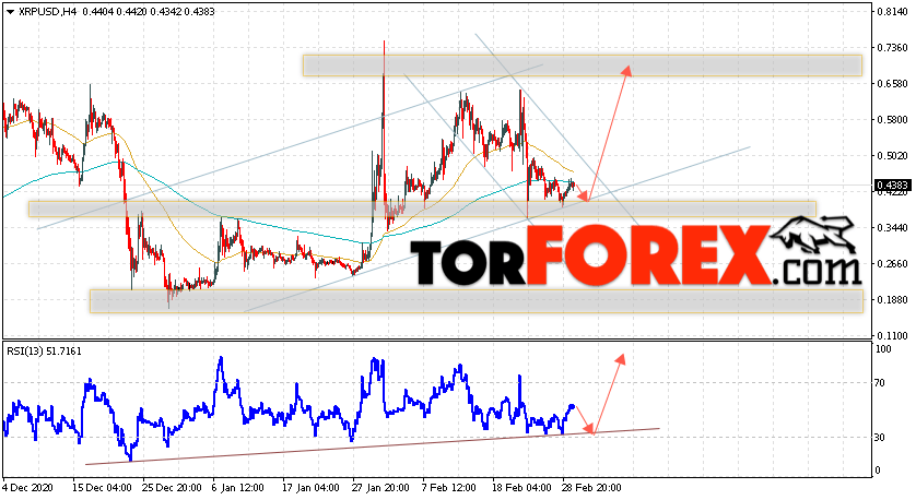 Таким образом, Криптовалюта XRP прогноз курса на 3 марта 2021 предполагает попытку теста уровня поддержки вблизи области 0.4255. Откуда стоит ожидать продолжения подъёма криптовалюты с потенциальной целью на уровне 0.6565. Дополнительным сигналом в пользу роста Ripple выступит тест линии тренда на индикаторе относительной силы. Отменой варианта подъёма котировок станет падение и пробой области 0.3355. В этом случае стоит ожидать продолжения снижения подъёма по цифровой валюте с целью ниже 0.2825.