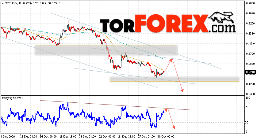 В пользу снижения котировок XRP/USD выступит тест нисходящей линии тренда на индикаторе относительной силы. Вторым сигналом в пользу роста котировок актива станет отскок от верхней границы нисходящего канала. Отменой варианта падения криптовалюты станет сильный рост и закрытие котировок выше уровня 0.3655. Это укажет на пробой области сопротивления и продолжение подъёма XRP/USD в область выше уровня 0.4505. Подтверждением падения курса цифровой валюты выступит пробой области поддержки и закрытие под уровнем 0.1155.