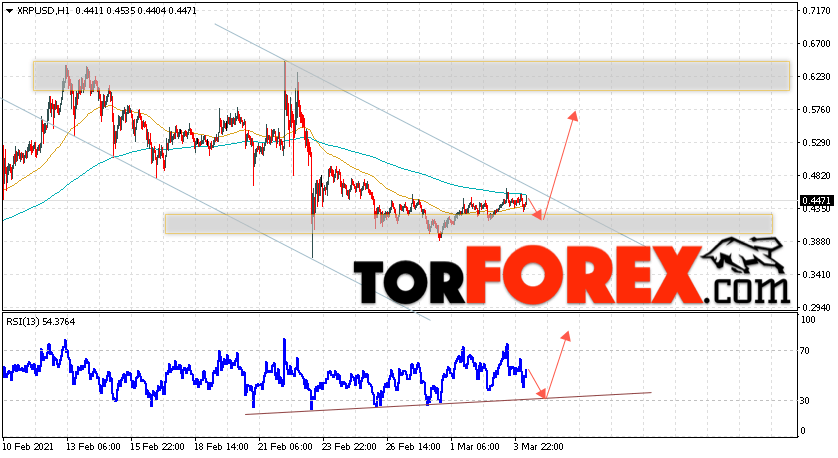 Таким образом, Криптовалюта XRP прогноз курса на 5 марта 2021 предполагает попытку теста уровня поддержки вблизи области 0.4205. Откуда стоит ожидать продолжения подъёма криптовалюты с потенциальной целью на уровне 0.5765. Дополнительным сигналом в пользу роста Ripple выступит тест линии тренда на индикаторе относительной силы. Отменой варианта подъёма котировок станет падение и пробой области 0.3525. В этом случае стоит ожидать продолжения снижения подъёма по цифровой валюте с целью ниже 0.2865.