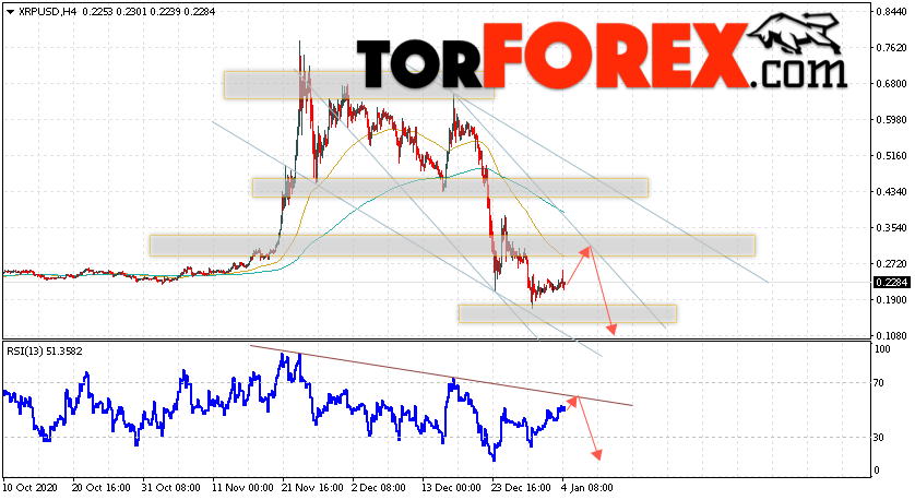 Таким образом, Криптовалюта XRP прогноз курса на 5 января 2021 предполагает попытку теста уровня сопротивления вблизи области 0.2975. Откуда стоит ожидать продолжения падения криптовалюты с потенциальной целью на уровне 0.1025. Дополнительным сигналом в пользу снижения Ripple выступит тест линии тренда на индикаторе относительной силы. Отменой варианта падения котировок станет сильный рост и пробой области 0.3765. В этом случае стоит ожидать продолжения развития подъёма по цифровой валюте с целью выше 0.4635.